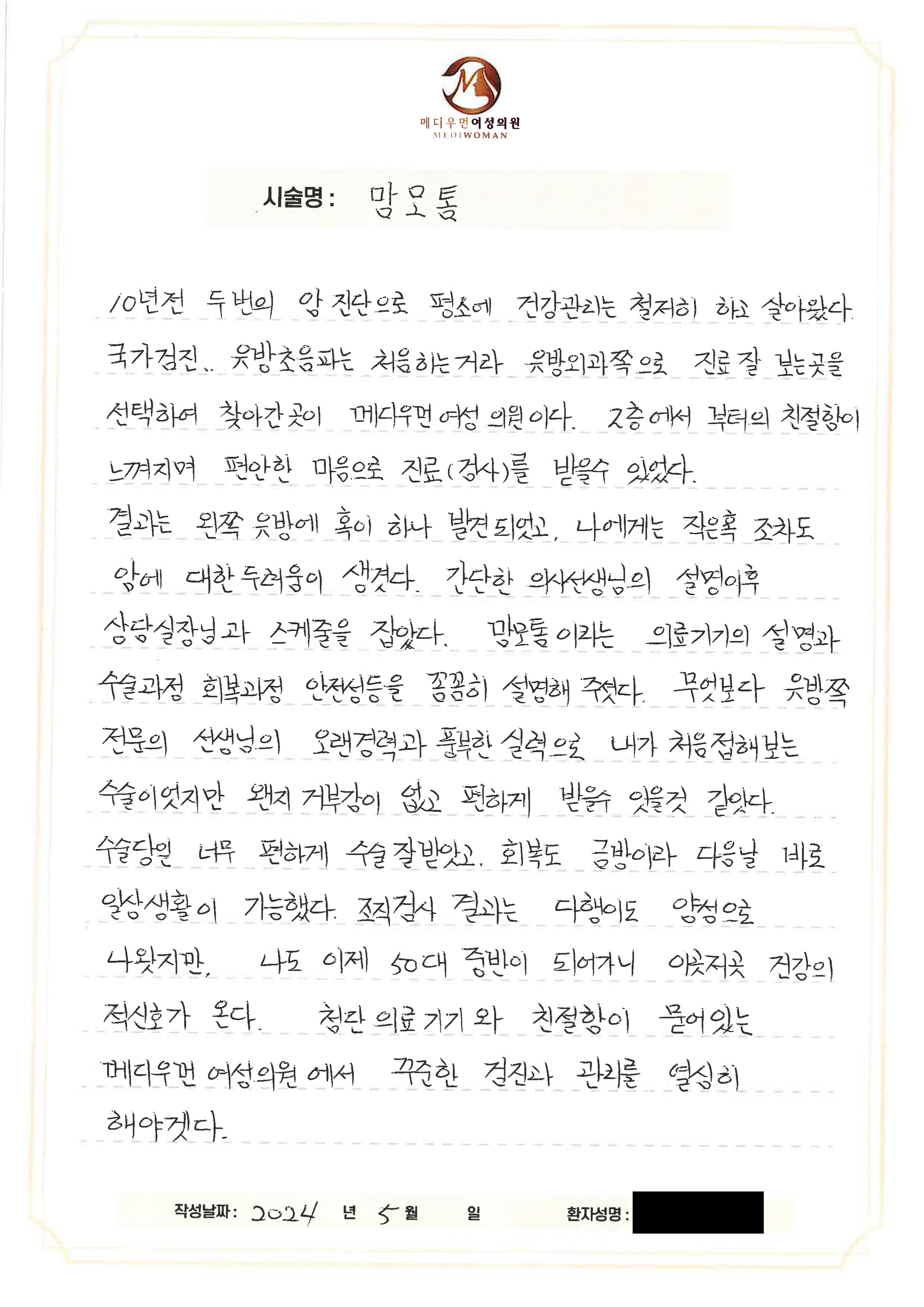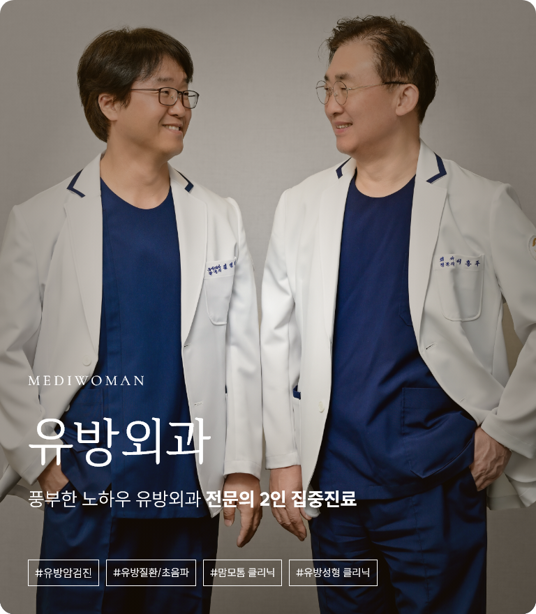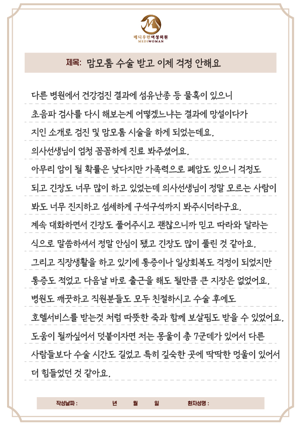 10년 전 두 번의 암 진단으로 평소에 건강관리는 철저히 하고 살아왔다.국가검진... 유방초음파는 처음 하는 거라 유방외과 쪽으로 진료 잘 보는 곳을선택하여 찾아간 곳이 메디우먼여성의원이다.2층에서부터의 친절함이 느껴지며 편안한 마음으로 진료(검사)를 받을 수 있었다.결과는 왼쪽 유방에 혹이 하나 발견되었고, 나에게는 작은 혹 조차도암에 대한 두려움이 생겼다.간단한 의사선생님의 설명 이후 상담실장님과의 스케줄을 잡았다.맘모톰이라는 의료기기의 설명과 수술 과정, 회복 과정, 안정성 등을 꼼꼼히 설명해 주었다.무엇보다 유방 쪽 전문의 선생님의 오랜 경력과 풍부한 실력으로 내가 처음 접해보는수술이었지만 왠지 거부감이 없고 편하게 받을 수 있을 것 같았다.수술 당일 너무 편하게 수술 잘 받았고, 회복도 금방이라다음 날 바로 일상생활이 가능했다.조직 검사 결과는 다행히도 양성으로 나왔지만, 나도 이제50대 중반이 되어가니 이곳저곳 건강의 적신호가 온다.첨단 의료기기와 친절함이 묻어있는 메디우먼여성의원에서꾸준한 검진과 관리를 열심히 해야겠다.