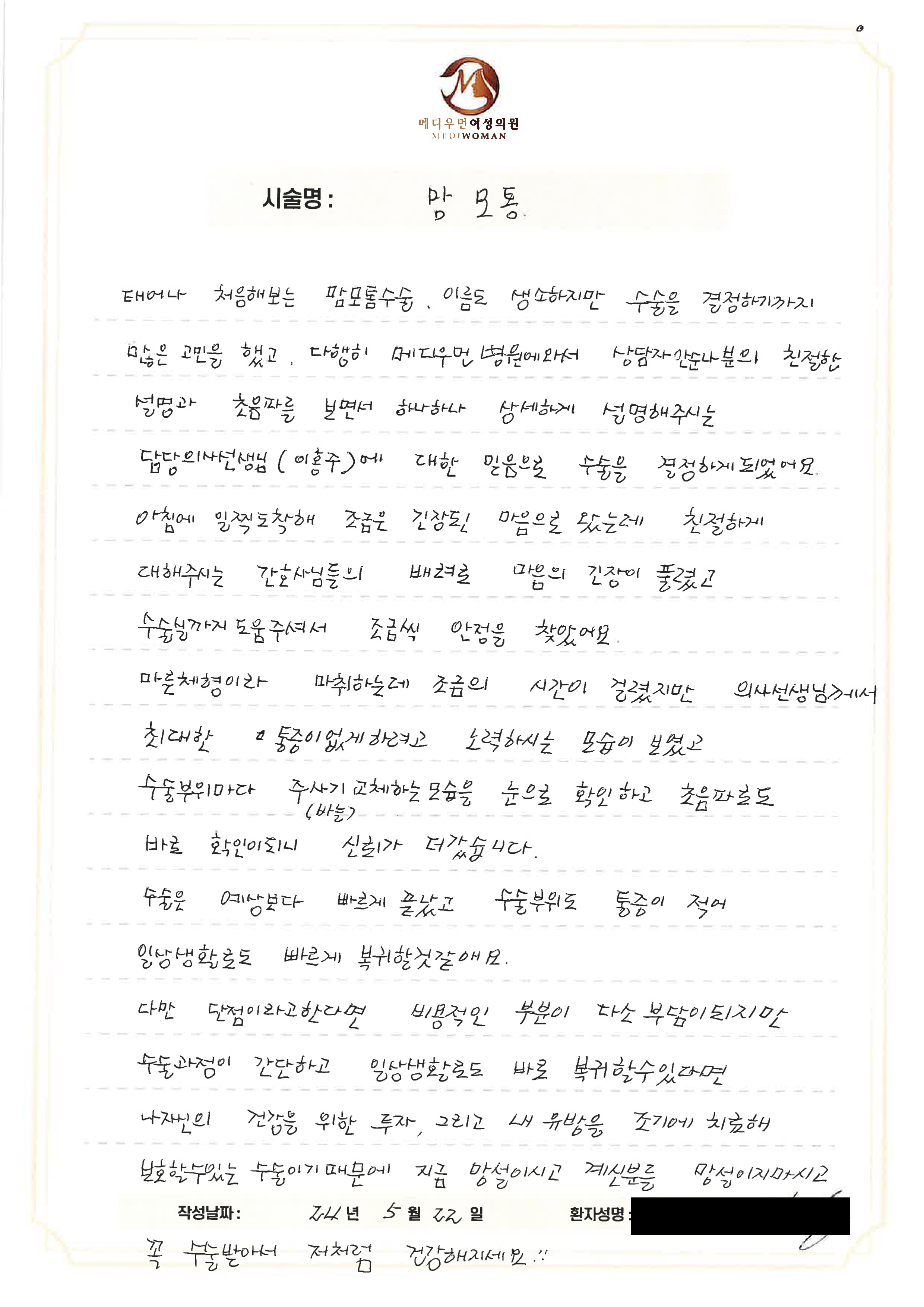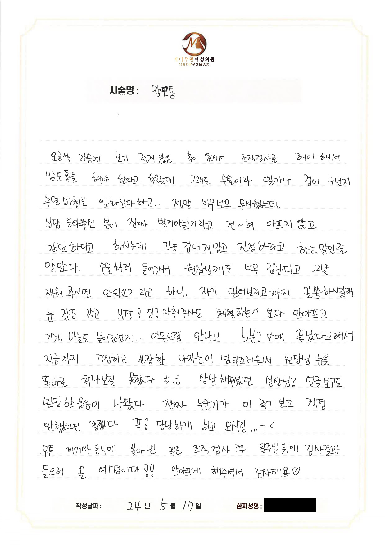 태어나 처음 해보는 맘모톰 수술.이름도 생소하지만 수술을 결정하기까지 많은 고민을 했고다행히 메디우먼 병원에 와서 상담자 안순나분의 친절한 설명과초음파를 보면서 하나하나 상세하게 설명해 주시는 담당 의사선생님(이홍주)에 대한 믿음으로 수술을 결정하게 되었어요.아침에 일찍 도착해 조금은 긴장된 마음으로 왔는데 친절하게 대해주시는간호사님들의 배려로 마음의 긴장이 풀렸고 수술실까지 도움 주셔서조금씩 안정을 찾았어요.마른 체형이라 마취하는데 조금의 시간이 걸렸지만의사선생님께서 최대한 통증이 없게 하려고 노력하시는 모습이 보였고수술 부위마다 주사기 교체하는 모습을 눈으로 확인하고초음파로도 바로 확인이 되니 신뢰가 더 갔습니다.수술은 예상보다 빠르게 끝났고 수술 부위도 통증이 적어일상생활로도 빠르게 복귀한 것 같아요.다만 단점이라고 한다면 비용적인 부분이 다소 부담이 되지만수술 과정이 간단하고 일상생활로도 바로 복귀할 수 있다면나 자신의 건강을 위한 투자, 그리고 내 유방을 조기에 치료해보호할 수 있는 수술이기 때문에 지금 망설이고 계신 분들망설이지 마시고 꼭 수술받아서 저처럼 건강해지세요!!