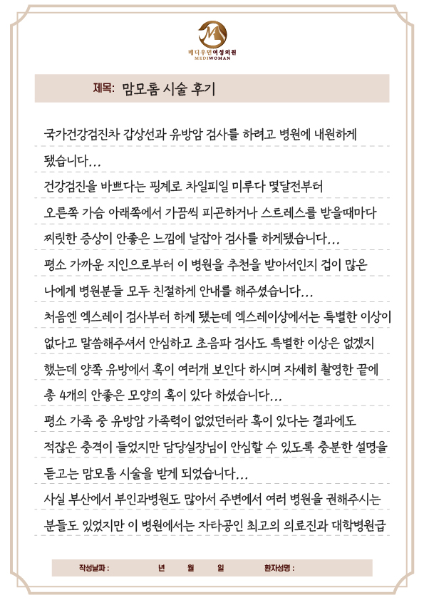 국가건강검진차 갑상선과 유방암 검사를 하려고 병원에 내원하게 됐습니다...건강검진을 바쁘다는 핑계로 치일피일 미루다 몇달전부터 오른쪽 가슴 아래쪽에서가끔씩 피곤하거나 스트레스를 받을때마다 찌릿한 증상이 안좋은 느낌에 날잡아 검사를 하게됐습니다...평소 가까운 지인으로부터 이 병원을 추천을 받아서인지 겁이 많은 나에게 병원분들 모두 친절하게 안내를 해주셨습니다...처음엔 엑스레이 검사부터 하게 됐는데 엑스레이상에서는 특별한 이상이 없다고 말씀해주셔서안심하고 초음파 검사도 특별한 이상은 없겠지 했는데 양쪽 유방에서 혹이 여러개 보인다 하시며자세히 촬영한 끝에 총 4개의 안좋은 모양의 혹이 있다 하셨습니다...평소 가족 중 유방암 가족력이 없었던터라 혹이 있다는 결과에도 적잖은 충격이 들었지만담당실장님이 안심할 수 있도록 충분한 설명을 듣고는 맘모톰 시술을 받게 되었습니다...사실 부산에서 부인과병원도 많아서 주변에서 여러 병원을 권해주시는 분들도 있었지만이 병원에서는 자타공인 최고의 의료진과 대학병원급 기계와 의술을 겸비하고 있다는 이야기를 듣고는망설임 없이 바로 시술 날짜를 잡게 되었습니다.시술 당일은 가벼운 아침식사를 하고 병원에 자가용이 아닌 택시로 병원에 와서 입원실 안내를 받고환자복으로 갈아입고 수술실로 안내를 받았습니다... 따로 마취는 하지 않고 국소마취를 통해 로프로 사술을 하게 됐는데로프가 들어갈 때 잠깐 따끔했지만 바로 마취가 되어서 엄살 심한 저도 그런대로 참을만 했네요...총 4개의 혹을 제거를 하면서 조직검사도 같이 하게 되었구 압박붕대로 감아주셨습니다.좀 쎄게 감은 듯하여 첨엔 답답했지만 오히려 시술부위가 감싸졌는지 아픈 낌이 거의 없어 나중엔 편했던 것 같습니다...시술 시간은 총 30분 안으로 끝났던 것 같습니다...그래도 수술이라고 놀라고 긴장했던러라 정신이 좀 없었네요...바로 입원실 간호사분의 친절한 안내로 입원실로 가서 아주 편안하고 쾌적하게 쉬었던 것 같습니다.퇴원할 때 가족과 함께 집으로 와서도 크게 힘든 점도 없었고 잘때만 똑바로 자면 될 것 같습니다. 병원에서 주는 항생제를 먹고 갔더니 방에도 아프지 않고 잘 갔던 것 같고다음날에도 크게 움직이지 않는 선에서 일상생활이 가능했습니다.혹시나 맘모톰 시술을 해야하는 분이라면 가격을 떠나서 어떤 의사선생님과 어떤 장비로 수술을 하는 게좋은 예후를 볼 수 있는지가 참 중요하니 잘 알아보시고 믿을 수 있는 여성전문병원에서 하시길 바랍니다~~~