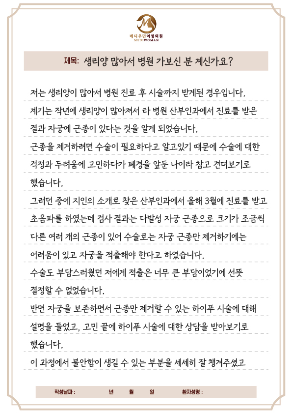 저는 생리양이 많아서 병원 진료 후 시술까지 받게된 경우입니다.계기는 작년에 생리양이 많아져서 타 병원 산부인과에서 진료를 받은 결과 자궁에 근종이 있다는 것을 알게 되었습니다.근종을 제거하려면 수술이 필요하다고 알고있기 때문에 수술에 대한 걱정과 두려움에고민하다가 폐경을 앞둔 나이라 참고 견뎌보기로 했습니다.그러던 중에 지인의 소개로 찾은 산부인과에서 올해 3원에 진료를 받고 초음파를 하였는데검사 결과는 다발성 자궁근종으로 크기가 조금씩 다른 여러 개의 근종이 있어수술로는 자궁근종만 제거하기에는 어려움이 있고 자궁을 적출해야 한다고 하였습니다. 수술도 부담스러웠던 저에게 적출은 너무 큰 부담이었기에 선뜻 결정할 수 없었습니다.반면 자궁을 보존하면서 군종만 제거할 수 있는 하이푸 시술에 대해 성명을 들었고,고민 끝에 하이푸 시술에 대한 상담을 받아보기로 했습니다.이 과정에서 불안함이 생길 수 있는 부분을 세세히 잘 챙겨주셨고실제로 이 병원에서 치료를 받고 많이 나온 케이스들을 많이 보여주셔서 믿음이 많이 생겼습니다. 생리양이 많아서 불편했던 부분도 하이푸 시술을 받으면 근종이 없어지면서 서서히 줄어든다는 얘기도 듣고 왔네요.마취 없어 시술이 진행되어서 다소 걱정은 되었지만 다행히 약간의 열감 외에는 통증 없이 편하게 시술이 끝났습니다.오히려 마취 없이 시술이 진행되어서 진행 과정을 직접 눈으로 확인하고바로바로 설명을 들을 수 있어서 좋았습니다.시술 중에도 원장님이나 간호사분들이 여로모로 신경써주시고 친절히 대해 주셔서걱정했던 부분들 없이 무사히 마친 수 있었던 것 같습니다.수술에 비하면 비싸지만 자궁 적은 대신 받은 시술이라고 생각하니손해라고 느껴지지도 않았고 오히려 받기를 잘했다는 생각도 드네요.저처럼 수술에 대한 걱정과 두려움으로 생리과다와 그로인한 빈혈증상을 참고 견디는 분들이 있으시다면하이푸 시술을 권해드리고 싶습니다.