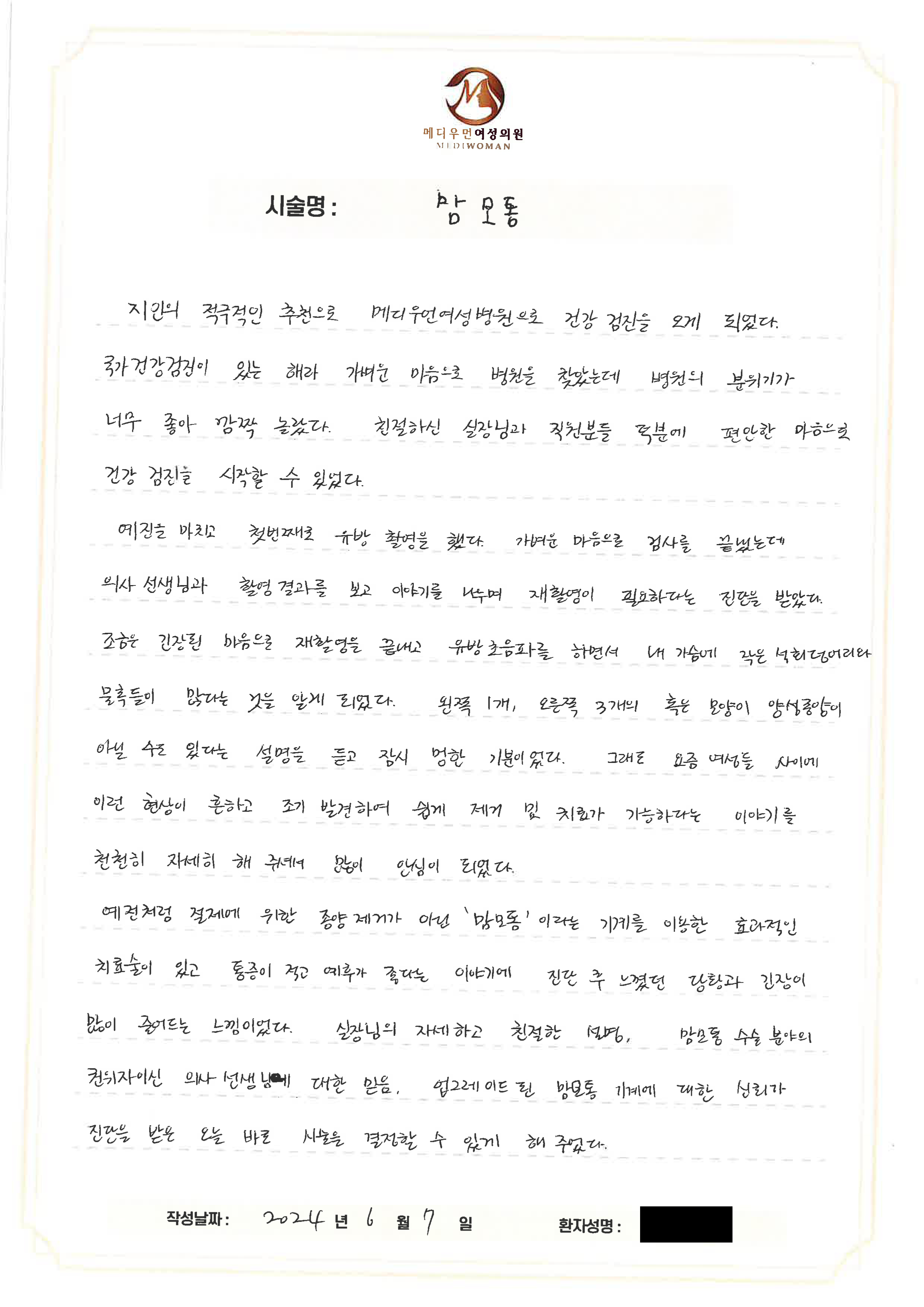 지인의 적극적인 추천으로 메디우먼여성의원으로 건강검진을 오게 되었다.국가건강검진이 있는 해라 가벼운 마음으로 병원을 찾았는데병원의 분위기가 너무 좋아 깜짝 놀랐다.친절하신 실장님과 직원분들 덕분에 편안한 마음으로 건강검진을 시작할 수 있었다.예진을 마치고 첫 번째로 유방 촬영을 했다.가벼운 마음으로 검사를 끝냈는데 의사선생님과 촬영 결과를 보고이야기를 나누며 재촬영이 필요하다는 진단을 받았다.조금은 긴장된 마음으로 재촬영을 끝내고 유방 초음파를 하면서내 가슴에 작은 석회덩어리와 물혹들이 많다는 것을 알게 되었다.왼쪽 1개, 오른쪽 3개의 혹은 모양이 양성종양이 아닐 수도 있다는설명을 듣고 잠시 멍한 기분이었다.그래도 요즘 여성들 사이에 이런 현상이 흔하고 조기 발견하여 쉽게제거 및 치료가 가능하다는 이야기를 천천히 자세히 해 주셔서 많이 안심이 되었다.예전처럼 절제에 의한 종양 제거가 아닌 '맘모톰'일는 기계를 이용한효과적인 치료술이있고 통증이 적고 예후가 좋다는 이야기에진단 후 느꼈던 당황과 긴장이 많이 줄어드는 느낌이었다.실장님의 자세하고 친절한 설명, 맘모톰 수술 분야의 권위자이신의사선생님에 대한 믿음, 업그레이드된 맘모톰 기계에 대한 신뢰가진단을 받은 오늘 바로 시술을 결정할 수 있게 해주었다.처음 하는 시술이라 걱정되는 마음은 없지 않았지만 의사선생님의전문적이고 친절한 진료에 안심하고 맘모톰 시술을 끝낼 수 있었으며큰 통증 없이 시술이 끝나 놀라움도 컸다.입원실에서 회복을 하면서 직원분들의 꼼꼼한 보살핌이 너무 가사하고 감동적이었다.지인의 적극적인 추천이 너무 이해되는 하루였다.40대에 접어들면서 주변 친구들과 지인들이 병원 방문을자주 한다는 이야기를 전해 듣는다.친구와 주변 지인들에게도 메디우먼여성의원을 꼭 추천해 주고 싶다.실력 있는 의사선생님, 친절하고 전문적인 직원분들, 그리고 깨끗한 시설까지.누구에게든 추천하지 않을 수 없는 곳이다.오늘 정말 감사드립니다. 일주일 뒤에 또 뵙겠습니다!