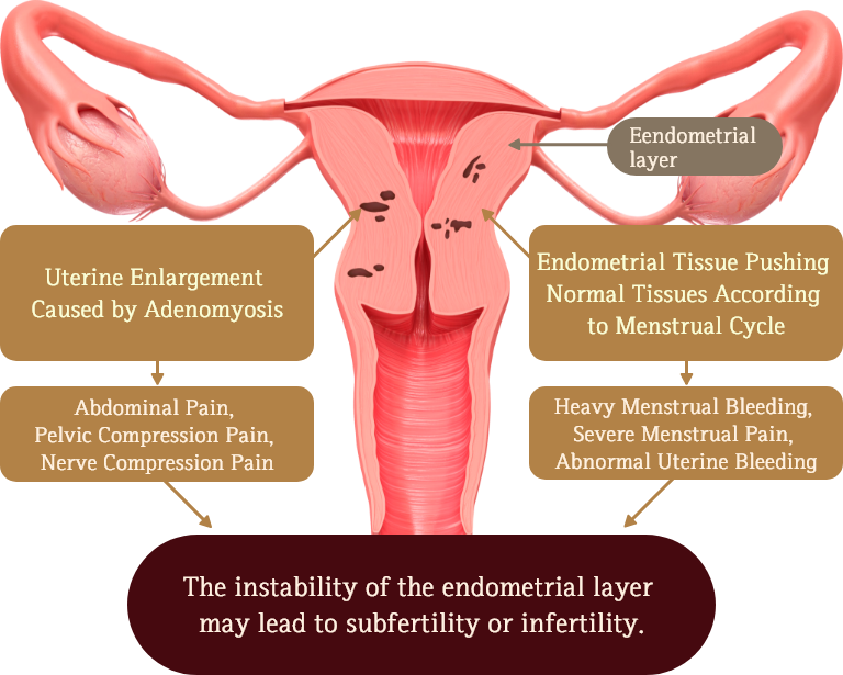 adenomyosis abnormally increases the uterine size during the menstrual cycle, leading to bleeding, pain, and compression.